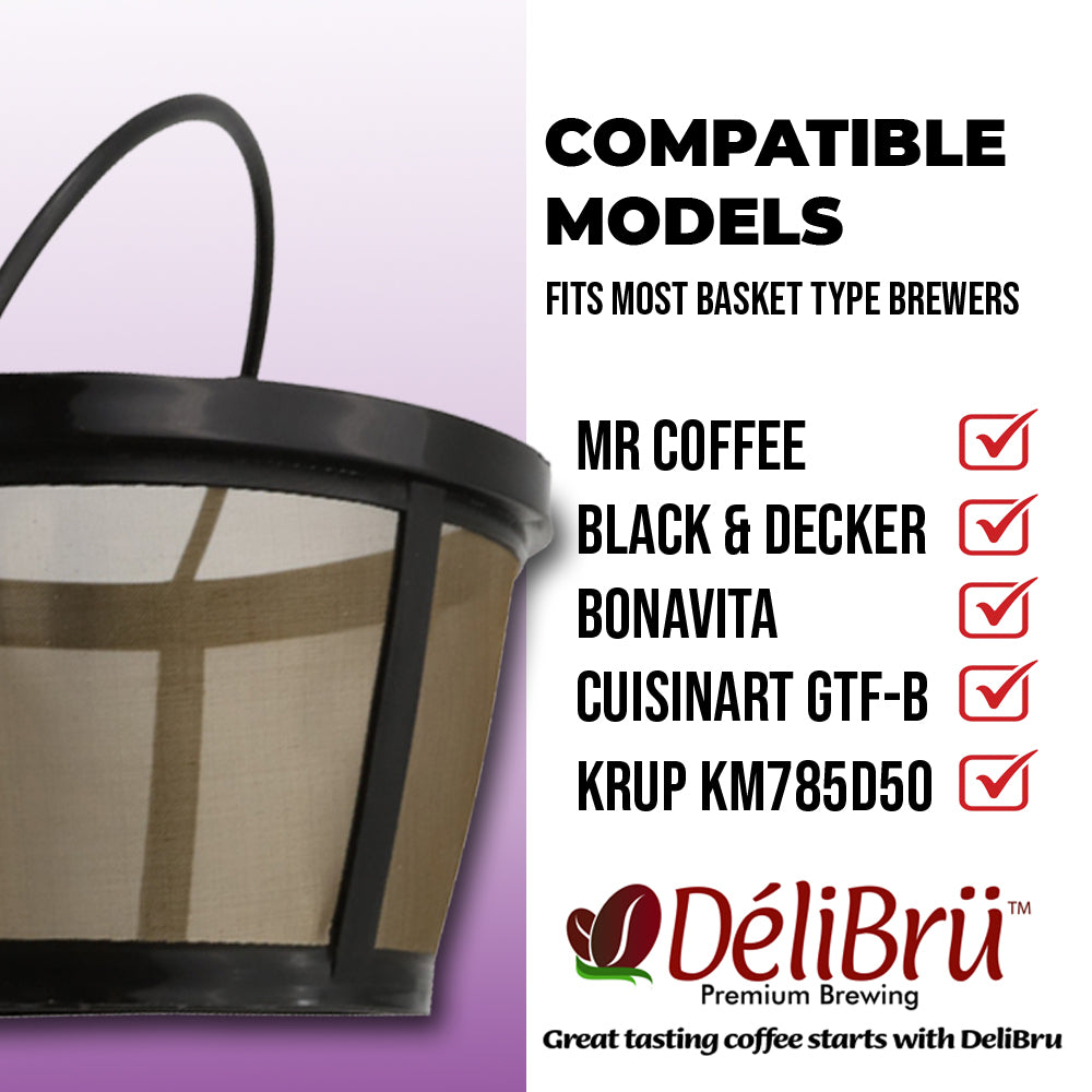 ✅ FITS MOST 8-12 BASKET TYPE BREWERS - Delibru Basket style reusable filters fits 8-12 cup basket-style coffeemakers such as Black & Decker, Bonavita, Cuisinart GTF-B, Krup KM785D50. Our reusable Mr Coffee filter basket will help you enjoy your favorite brews, anywhere you might be! Filter Basket fits any way you insert it Unlike other designs!